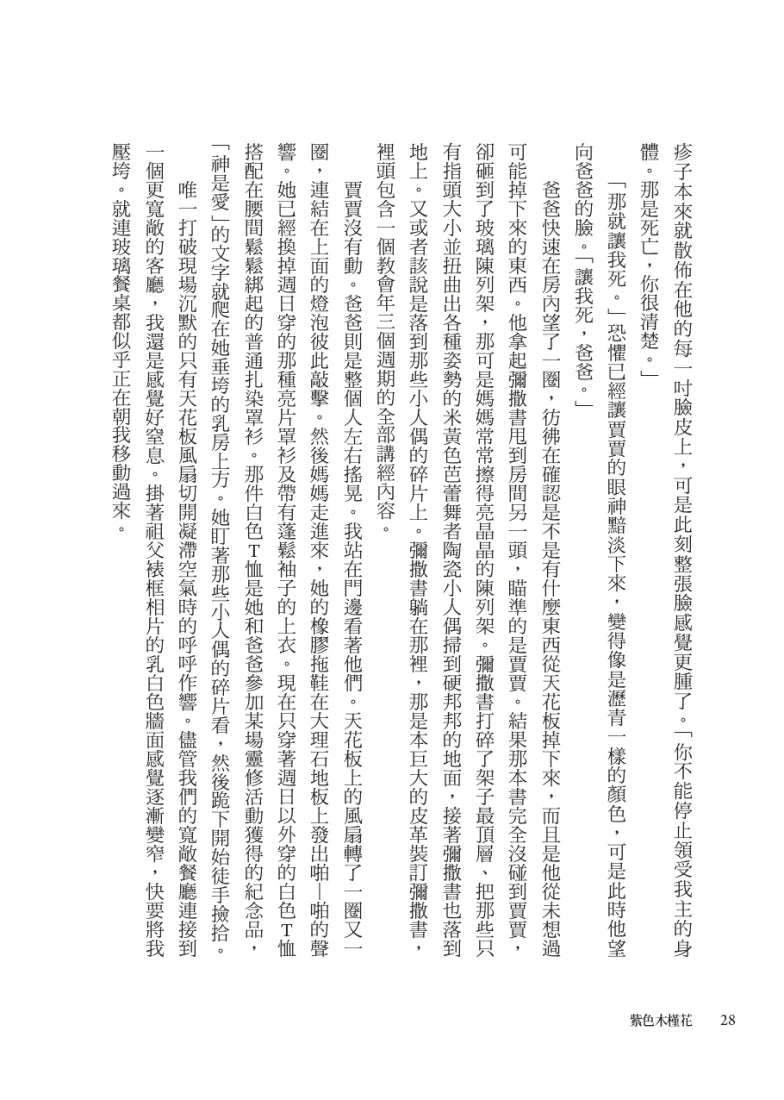 十五歲的凱姆比利與她的哥哥賈賈住在奈及利亞埃努古一座華麗的大宅中,他們衣食無缺,卻活在父親尤金嚴厲管束的陰影之下,時時刻刻都必須遵從尤金規定的宗教戒律行事。尤金是事業成功的商人,對外樂善好施,備受外界尊敬,但在家裡卻有著不為人知的黑暗一面。