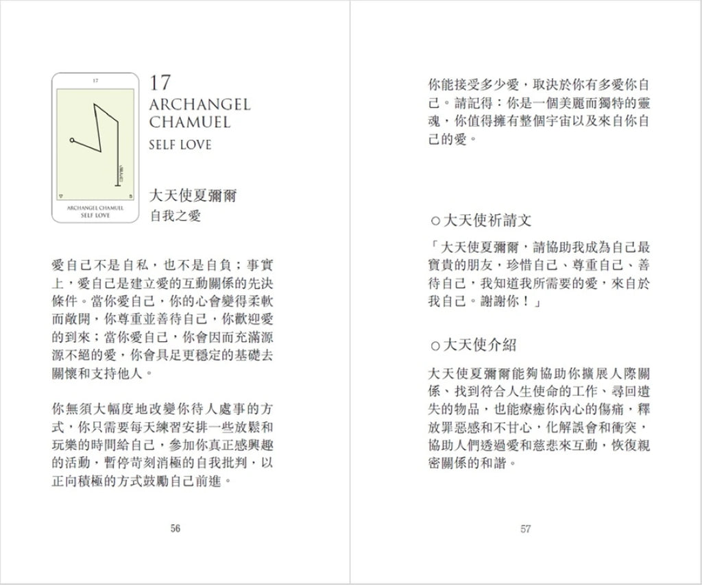 另外,除了內容,牌卡本身就具有療癒能量,可以放置在空間,也可以放在身上,尤其是心輪的位置,有印記的那一面朝下放置在身上。讀者也可以透過牌卡的祈請文,加強與對應大天使的連結和合作,用於冥想或自動書寫也非常適合。