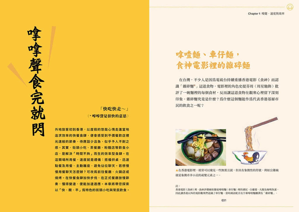 在香港,有許多為了解決「時間不夠」而生的效率型食肆,例如街頭小吃、茶餐廳、粉麵店等飮食小店,本章將帶您探索以「快、 靚、平」為特色的常民飮食,以及其中的故事和有意思的港台文化比對,還有各種源自食物的迷人香氣。