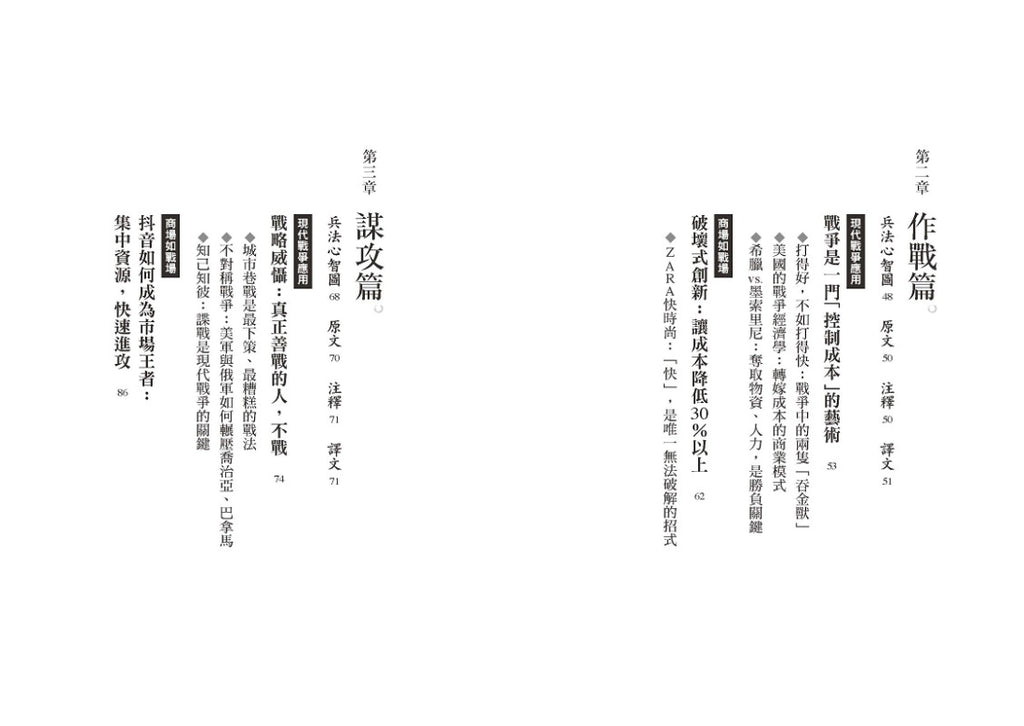 作者以《孫子兵法》13篇為架構,每篇開頭都將孫子的原文簡化為易懂的「兵法心智圖」,再透過超過50個實戰案例,來解析孫子的作戰策略。全書橫跨千年,從三國赤壁之戰、甲午戰爭、兩次世界大戰、越南戰爭到當代的俄烏戰爭,展現出「兵無常勢,水無常形」的戰爭變化,也揭示戰爭背後不變的戰略核心。
