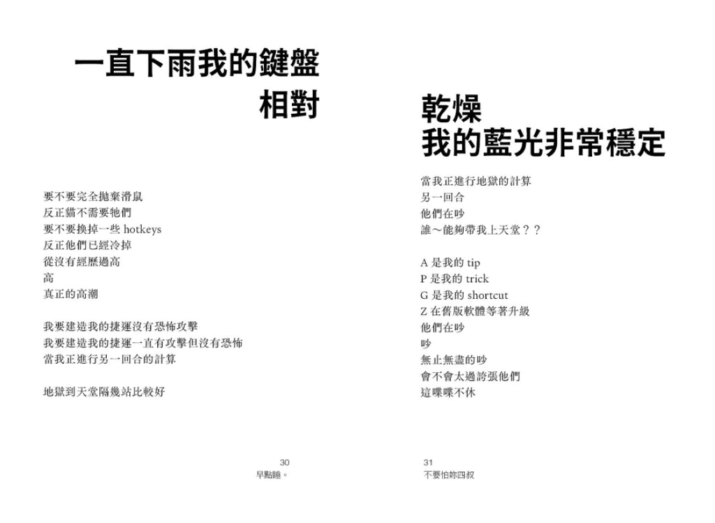 ‧ 中文詩選:《on/ off》、《沒有爹》、《我緊緊抱你的時候這世界好多人死》