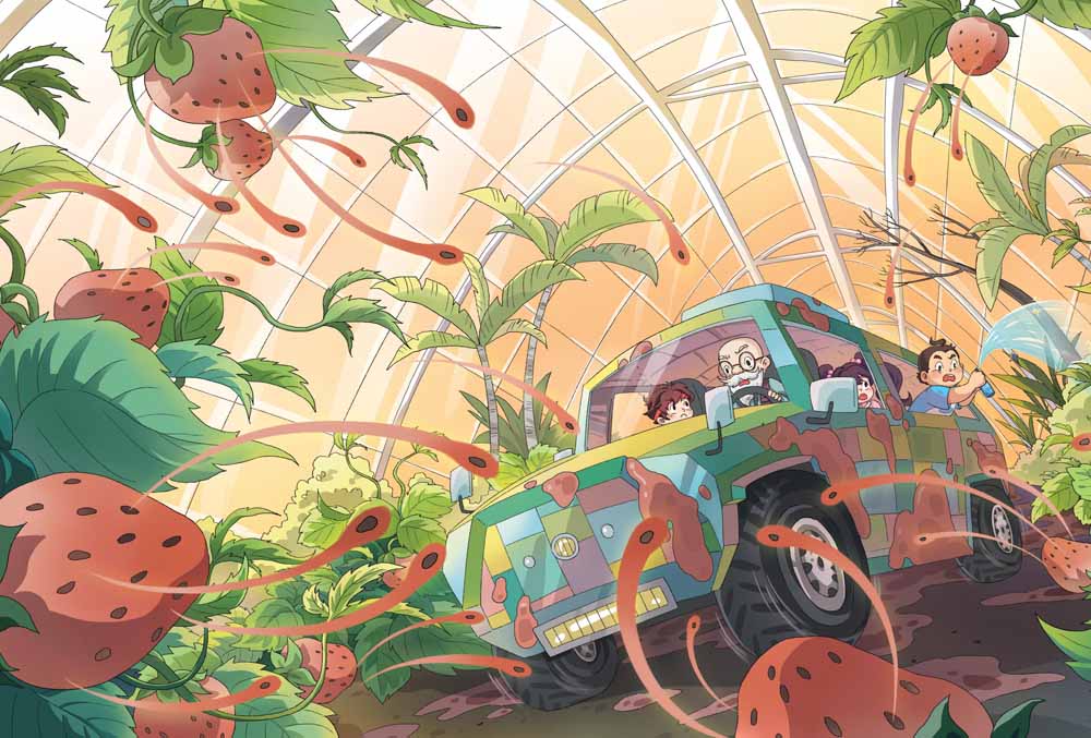 這天,凱糊塗老師帶著科學小組到植物園拜訪李博士,老師神筆一揮,神書飛船變身帥氣的神書裝甲車準備出發。一進到園裡,牆上地上竟然都是黏糊糊的紅色草莓汁,研究用的儀器和資料散了一地,李博士則倒在地上……一問之下,原來他研發了能讓植物死而復生的藥水,催生了植物園裡的大魔王,其他植物因此變得和平常不一樣了,該如何拯救它們?兇猛又狡滑的大魔王到底是誰,又藏身何處?