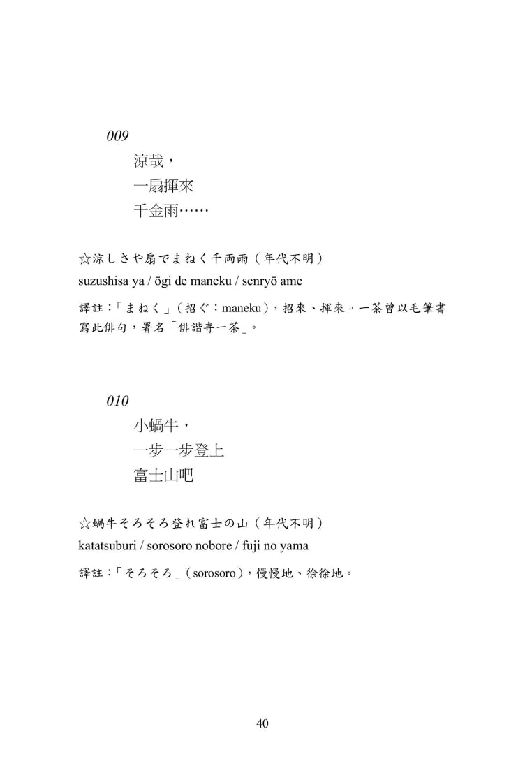 本書精心選譯500首一茶的俳句傑作,按年代先後編排並附上原文、讀音及註解,供讀者品味鑑賞。