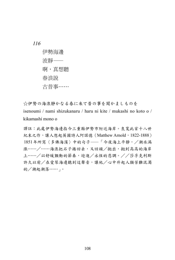 川端康成曾讚譽良寬是日本精神的象徵。陳黎與張芬齡以深厚詩學素養譯註導讀,帶領讀者穿越時空,走進這位詩僧澄澈寬廣的內在世界。