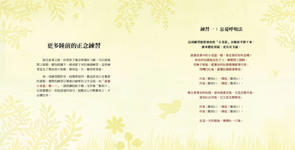 我最喜歡書中的「睡前正念練習」,它不僅能幫助孩子入睡,更是一段親子共處的心靈時光。當大人用柔軟的聲音朗讀,孩子在那份穩定的陪伴中,會感受到安全、信任與被愛,藉此打開通往甜美夢鄉的第一扇門。