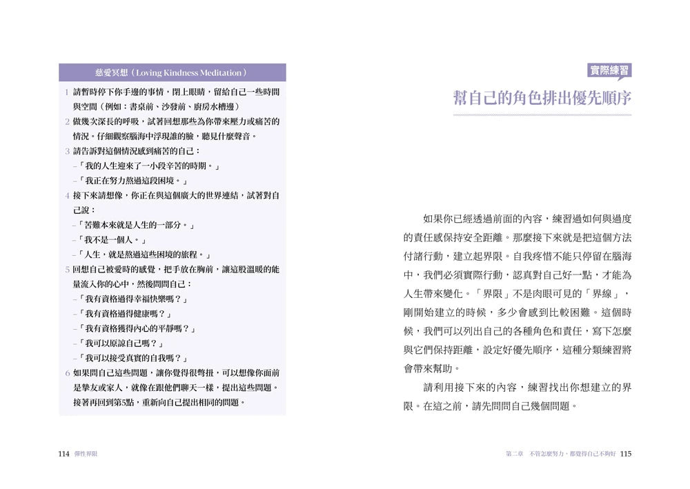 傾聽內心聲音、找到自己的核心和價值觀,和內在重新建立建結,將外界對你的過度要求視為雜音,作者在書中舉例並建議可應用的話術+表達語氣,伴你堅定面對總是踩線越界的人們。