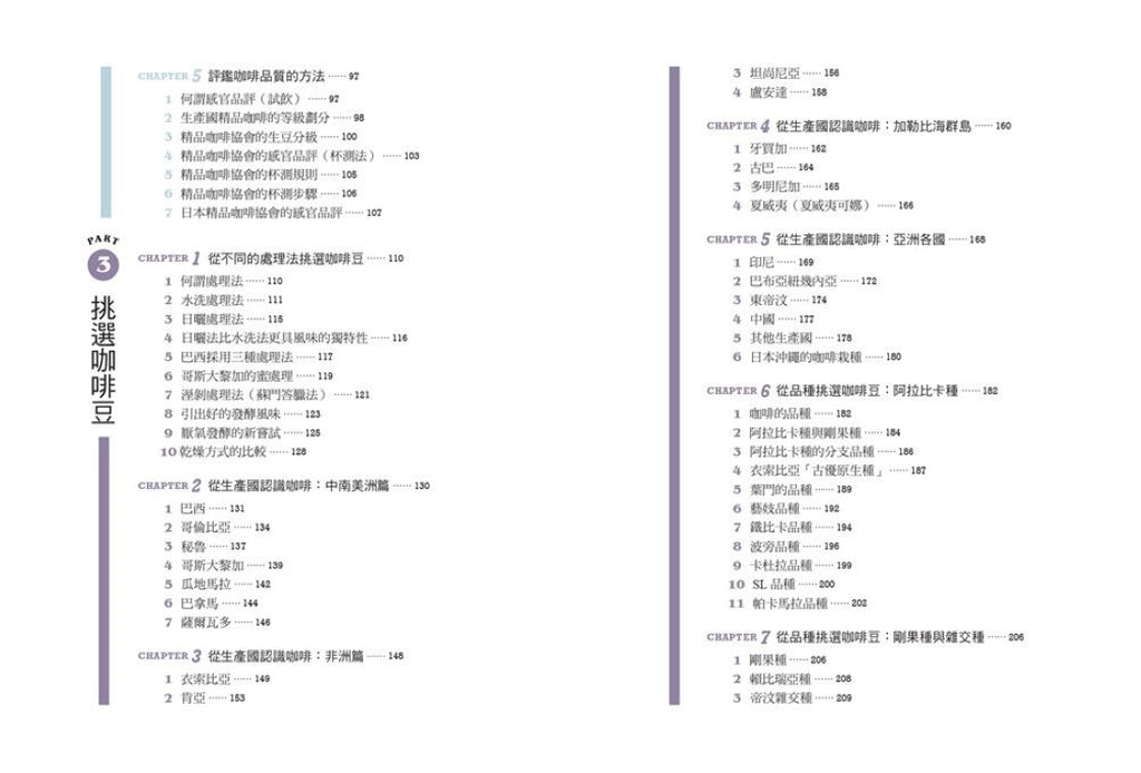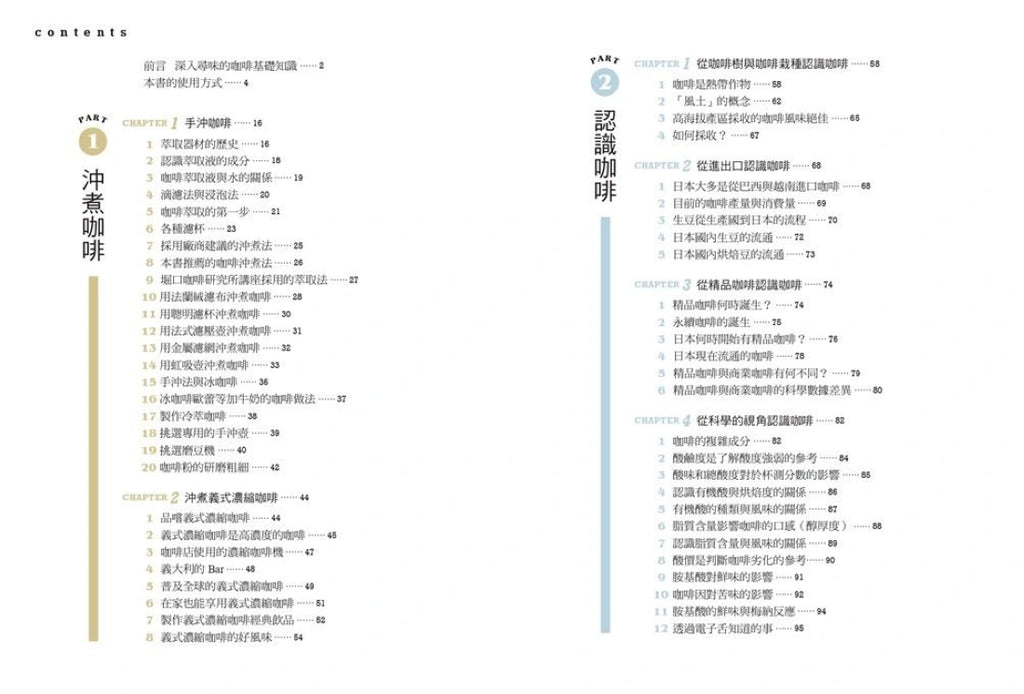 堀口俊英是日本精品咖啡教父,帶領了日本開始喝精品咖啡的風潮,本書是他以過往的實務經驗,加上科學的數值分析,補完咖啡風味輪廓圖。以實測的酸度、脂質量等數據,和精品咖啡協會的評分,分別從烘焙度、生產地、處理法和豆種等方向,一一列出影響風味的因素。