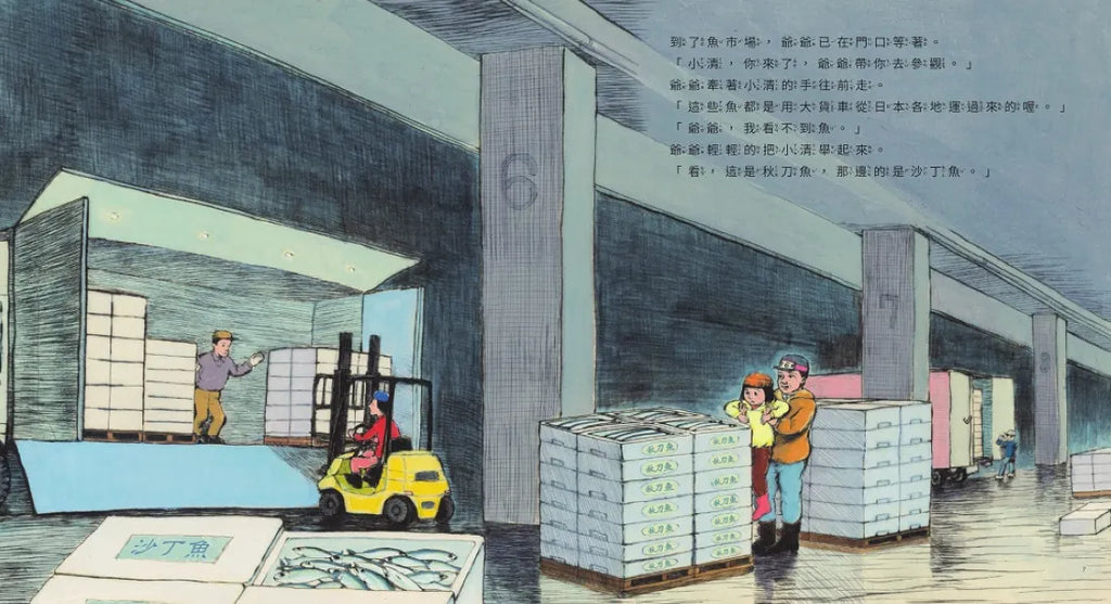 書中簡樸的人物造型,寫實的工作場景,也讓我們的彷彿身臨其境,一起和小清逛著中盤商聚集交易的魚市場,了解日常生活中豐盛的海鮮,是如何從海港「快遞」到我們的餐桌。