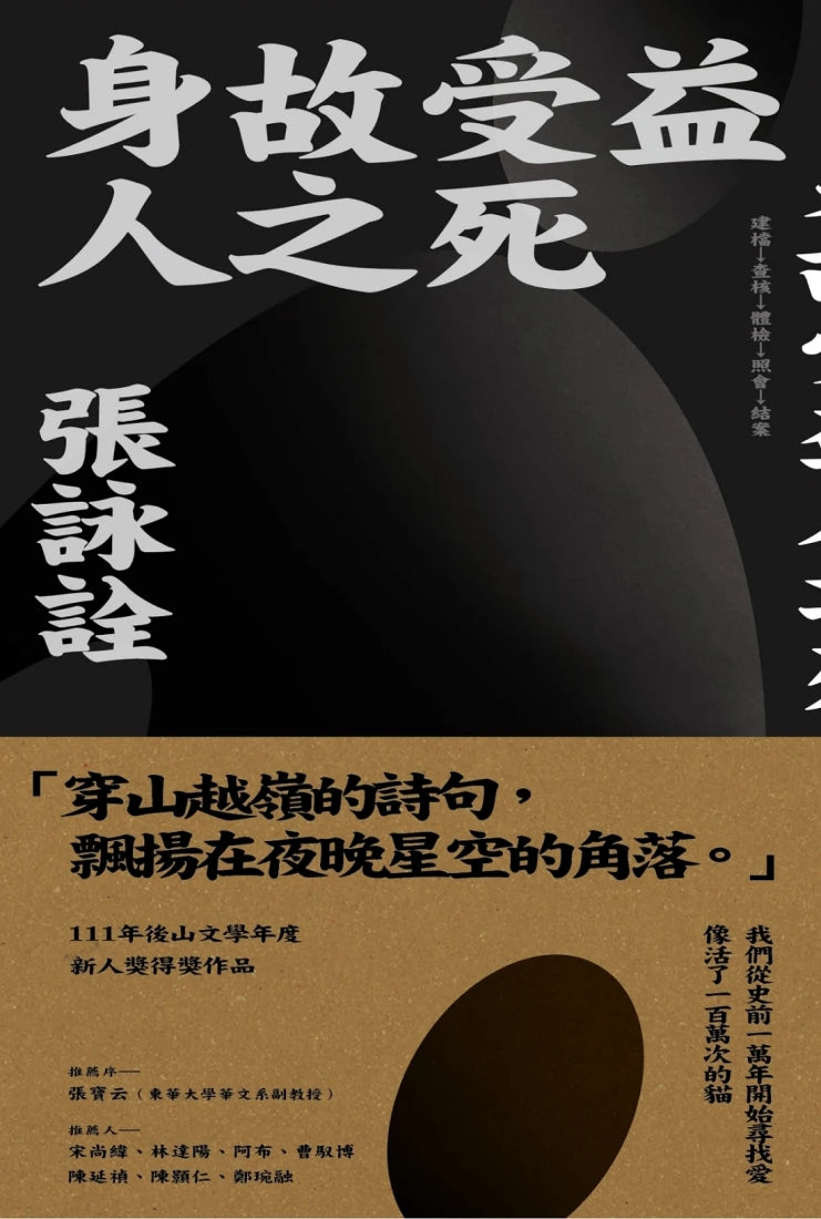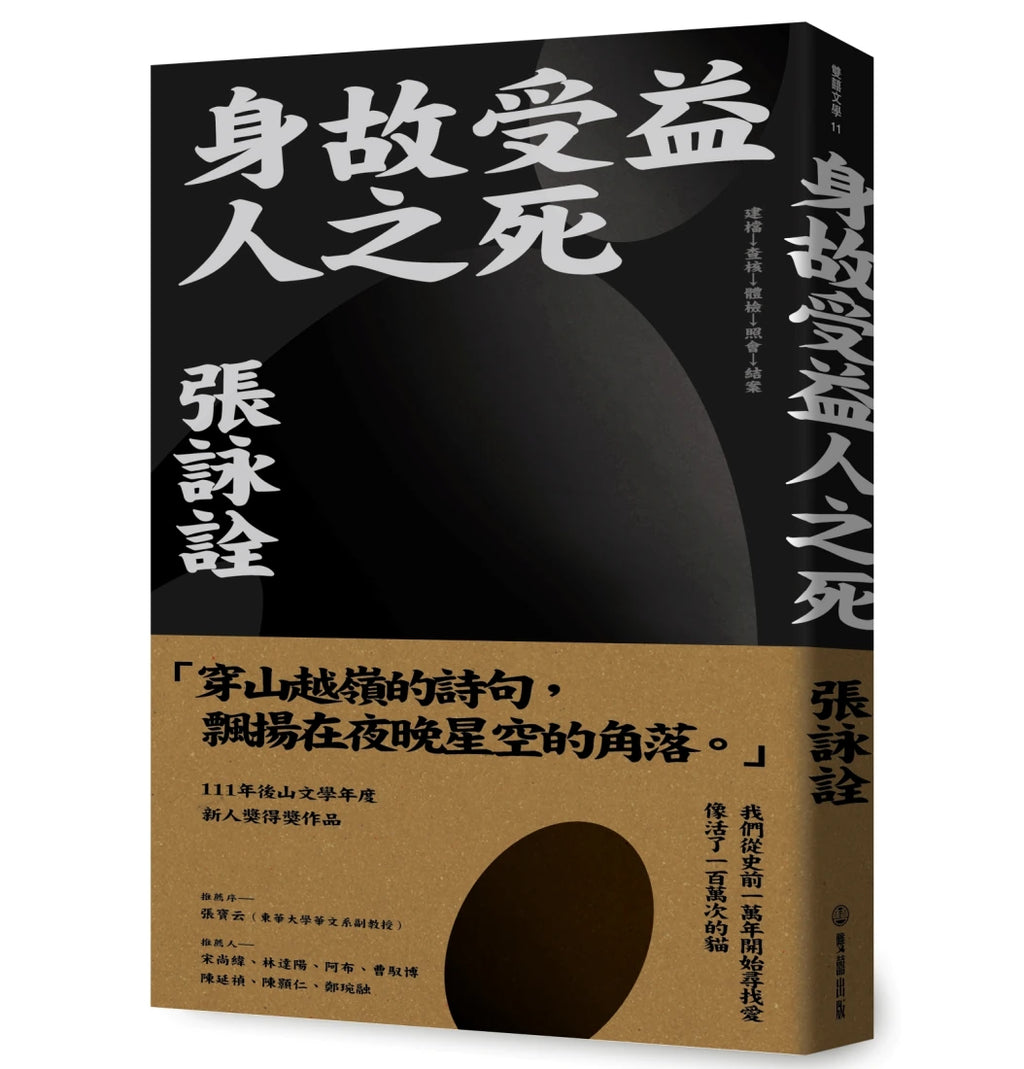 在保險的流程中,受益人的健康與安危或許是最不被人重視的一環,儘管他可能牽動著理賠方向。曾為保險公司核保人員的張詠詮,在承受了過量的工作,歷經了情感創傷後,決定將過往的傷痛成為創作的養分。借用核保的流程,討論現代社會人際的聯繫與疏離,並且尋求自我的認同。《身故受益人之死》中,不乏他者的故事,更有敘事者的身影,置身於愛情、親情、友情、職場和家庭之中,最終演化成生命的詩歌。