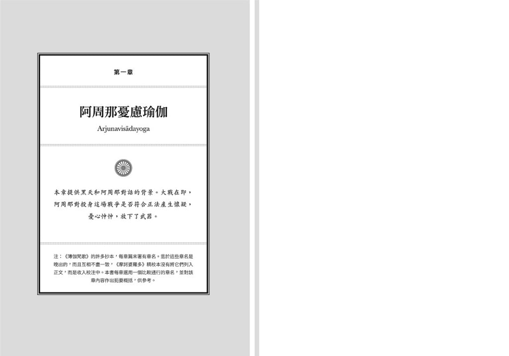 《薄伽梵歌》梵文原文是以每個詩節兩行四音步、每音部八個音節共三十二個音節的古詩體方式創作,然而目前本地所見的數種譯文版本皆以通俗易懂的敍述為主,傳達了意、但失去了形及精,本譯文則在兼顧閱讀性的同時,盡量保留原本對稱的詩體,更加體現史詩滂礡、流暢的意境。