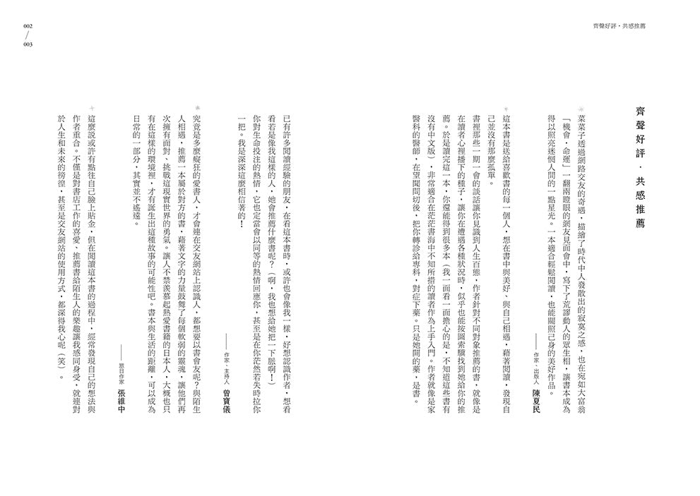 ◎這本書是送給喜歡書的每一個人,藉著閱讀與美好、與自己相遇,發現自己並沒有那麼孤單。作者就像是家醫科的醫師,在望聞問切後,把你轉診給專科,對症下藥。只是她開的藥,是書。——作家、主持人 曾寶儀