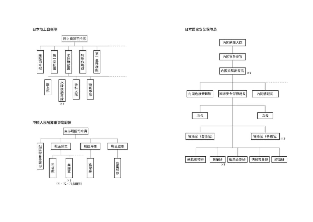❶軍事架構圖:日本陸上自衛隊、中國人民解放軍東部戰區、日本國家安全保障局