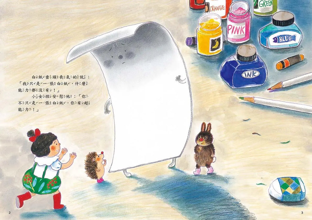 希望能透過本繪本,鼓勵幼兒發揮想像力,看見白紙的神奇及多元面貌,也在無形中體會到每一個人都有許多特點和無限可能。隨著白紙重新認識自己的過程,也讓幼兒或大人有機會重新看見不一樣的自己。