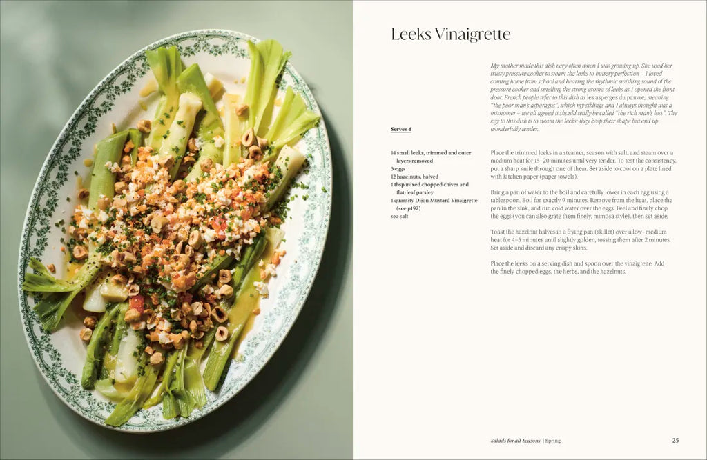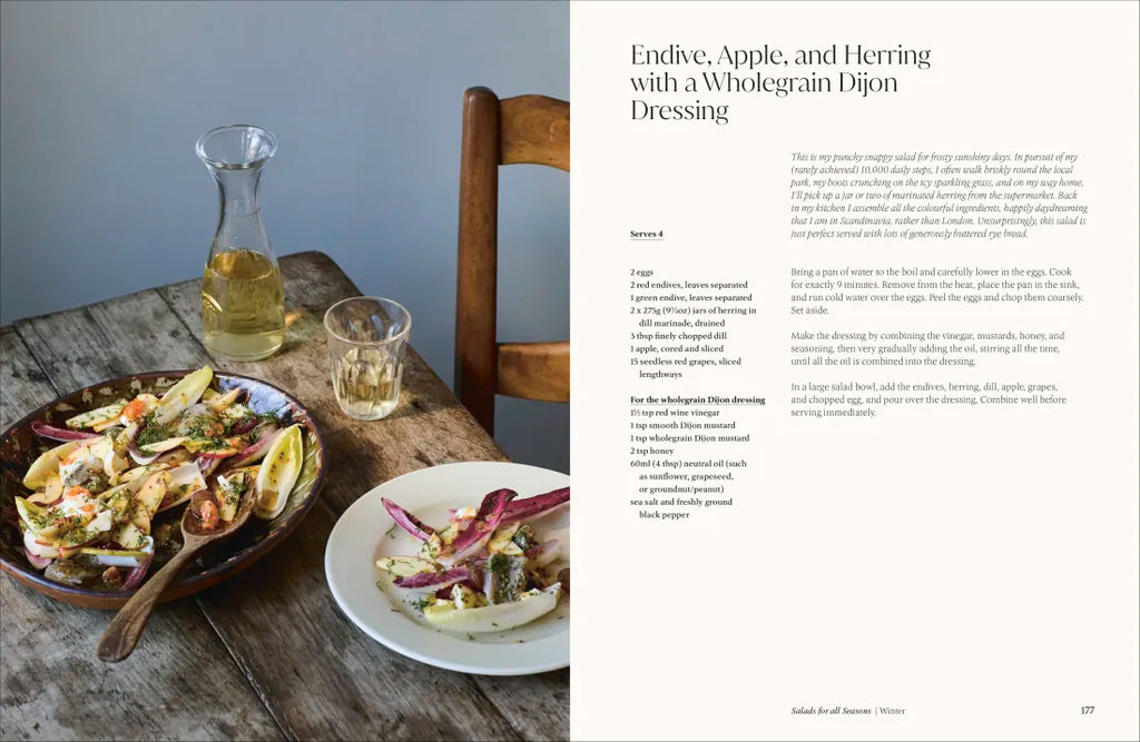 Recipes range from Squash, Puy Lentils, Shallots, and Roquefort with a Balsamic and Honey Dressing in autumn and Warm Chicken Salad with Roasted Shallots, Honey-glazed Parsnip, Rosemary Croutons, Fried Potato, and Crispy Kale in winter; through to Steamed Leeks and Egg Vinaigrette with Chopped Hazelnuts and Fresh Herbs in spring and Nectarines with Goats’ Cheese, Thyme, Basil, Cucumber, Radishes, Toasted Hazelnuts, and Black Olives in summer.