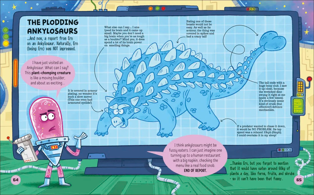 And what could make Earth even more exciting to our intergalactic explorers? Dinosaurs, of course! Hit the time-travel button on the spaceship's control panel and step back to the Mesozoic Era, meeting all of your favorite prehistoric creatures. What did the Earth look like 240 million years ago? Who would win in a race between Compsognathus and Allosaurus? And which dinosaur had armor over its eyelids? Alongside these fascinating facts, our alien tour guides are cracking jokes and performing poetry, covering all things prehistoric on our planet.
