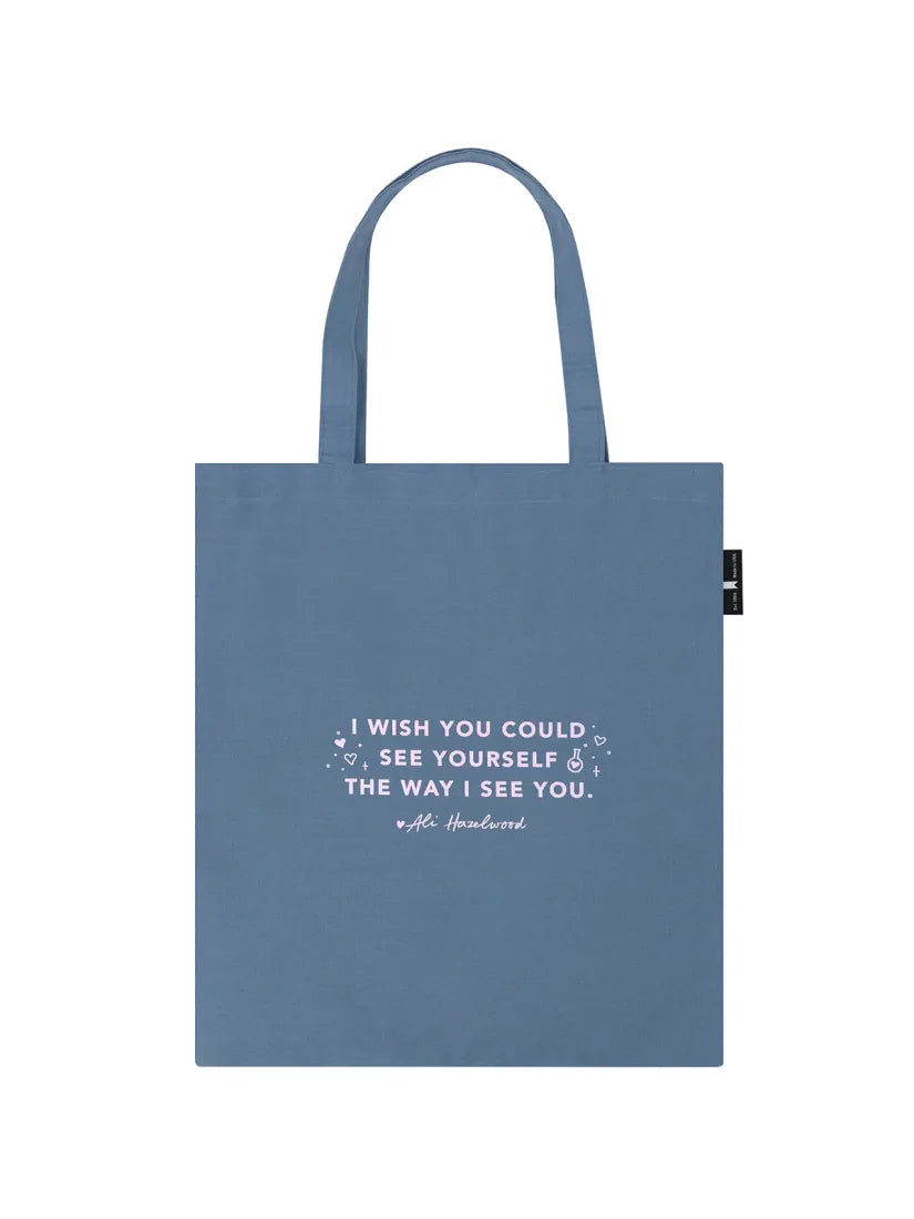 This tote bag features the book cover art for The Love Hypothesis on one side and the quote: "I wish you could see yourself the way I see you." on the other side. The Love Hypothesis is a 2021 romance novel by the New York Times bestselling author, Ali Hazelwood.