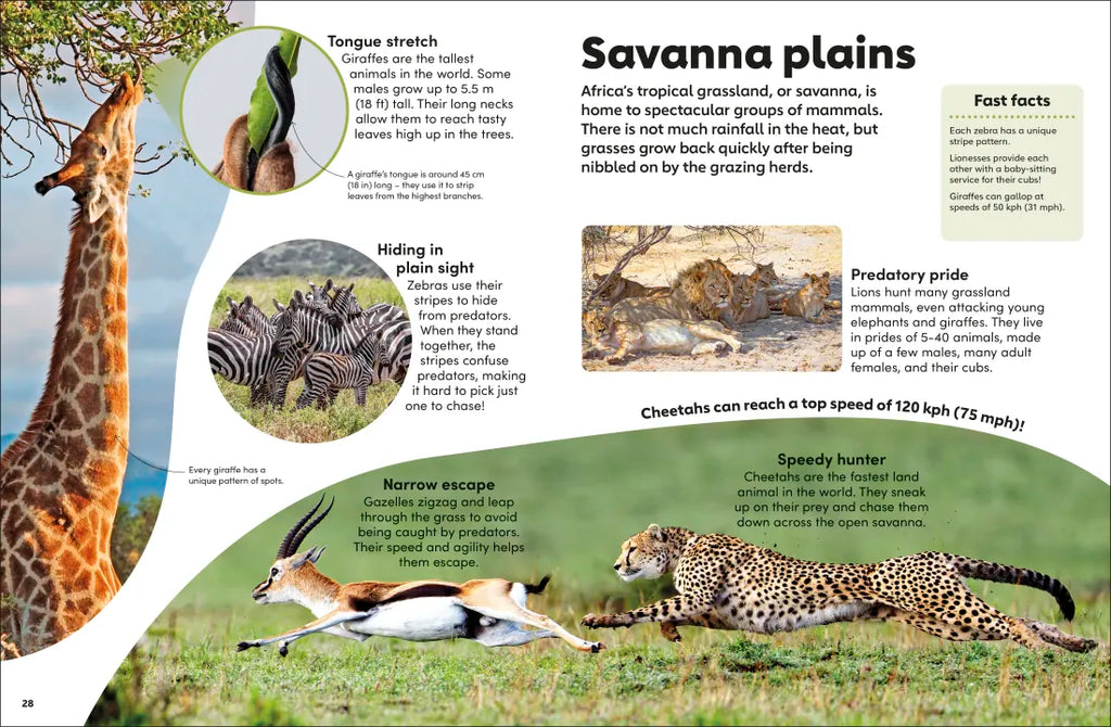 What makes a mammal a mammal? Does a tiny pygmy mouse belong to the same class of animals as the gigantic blue whale? Yes! They are both mammals, and so are you. With more than 6,000 discovered species, mammals come in all shapes and sizes – in nearly every habitat on Earth, from the Amazon Rainforest to the Sahara Desert. In this mammals book for kids 5–7, stunning photos of mammals moving, feeding, and taking care of their young bring these amazing animals to life. Plus, activities such as "Who am I" and "Jungle safari" will keep you entertained for a long time.
