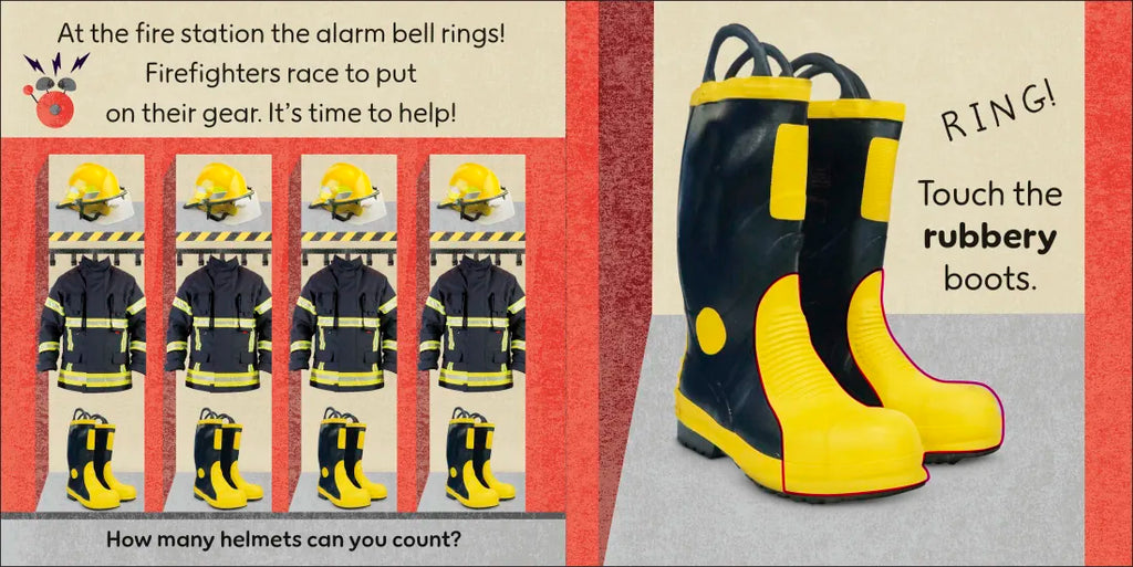 The alarm is ringing! That means our brave fire engine is ready for action. Feel its shiny, smooth, red paint, then unroll its bendy water hose. But what do its wheels feel like as it zooms to save the day? Touch and discover as we read along!