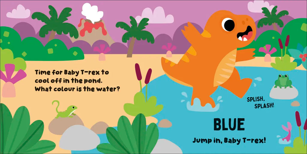 Little ones will love learning about colors in Baby T-rex's playful prehistoric world – yellow, red, blue, green, and orange!