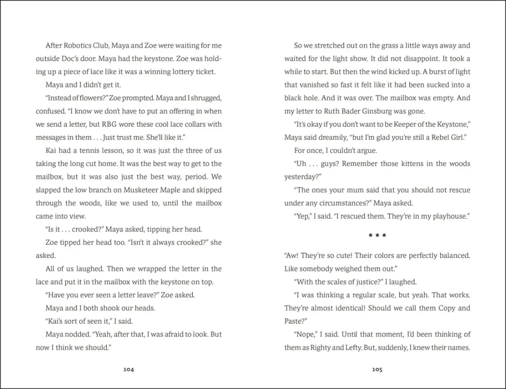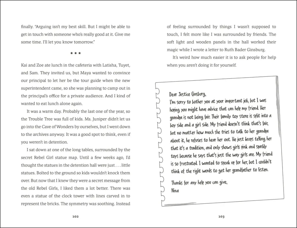 When the school’s new superintendent ignores what the kids want, bringing in uniforms, shutting down clubs, and getting the best teachers in trouble, it’s time for action! Luckily, Nina and her friends can turn to the mysterious mailbox for answers, and soon they have Ruth Bader Ginsburg’s advice in hand. Will it be enough to save Ada Lovelace Middle School and Ms. Jupiter? And will Nina finally feel ready to be a leader?