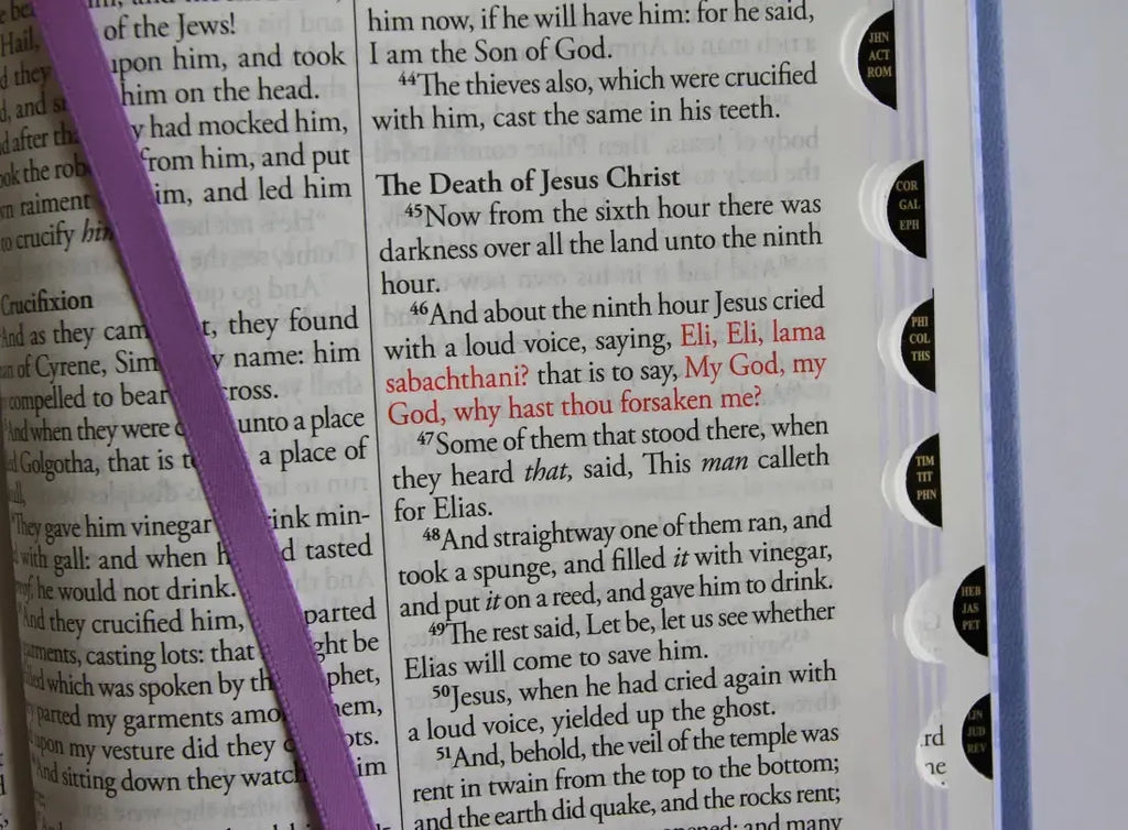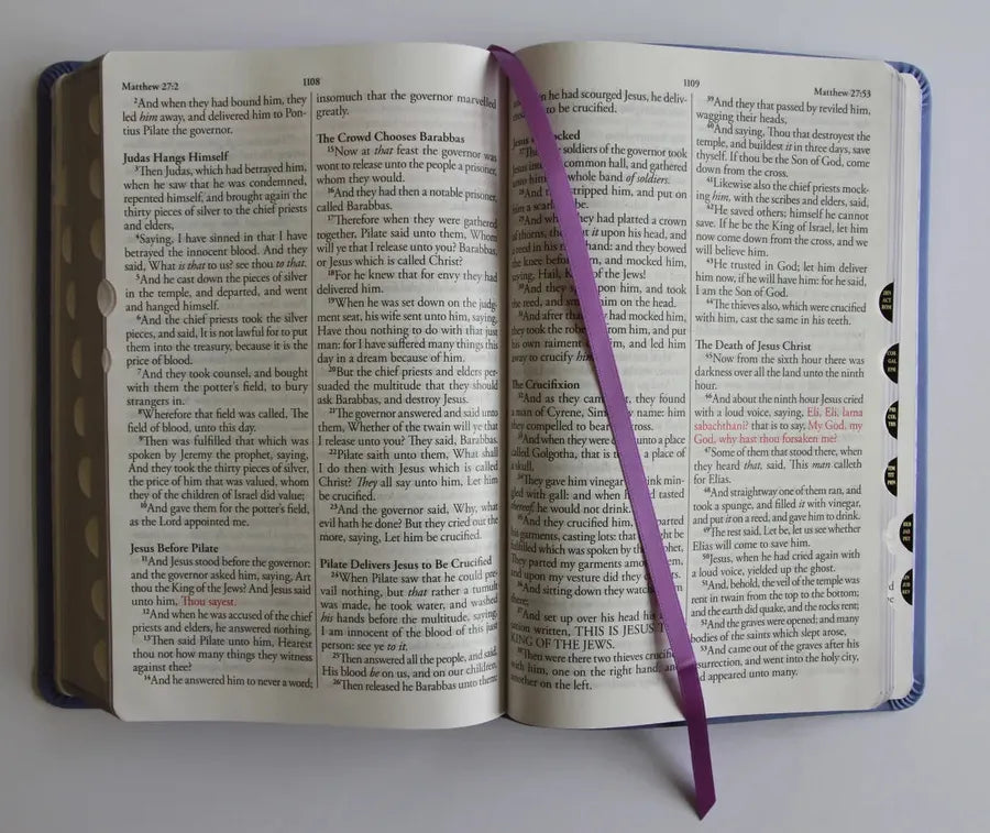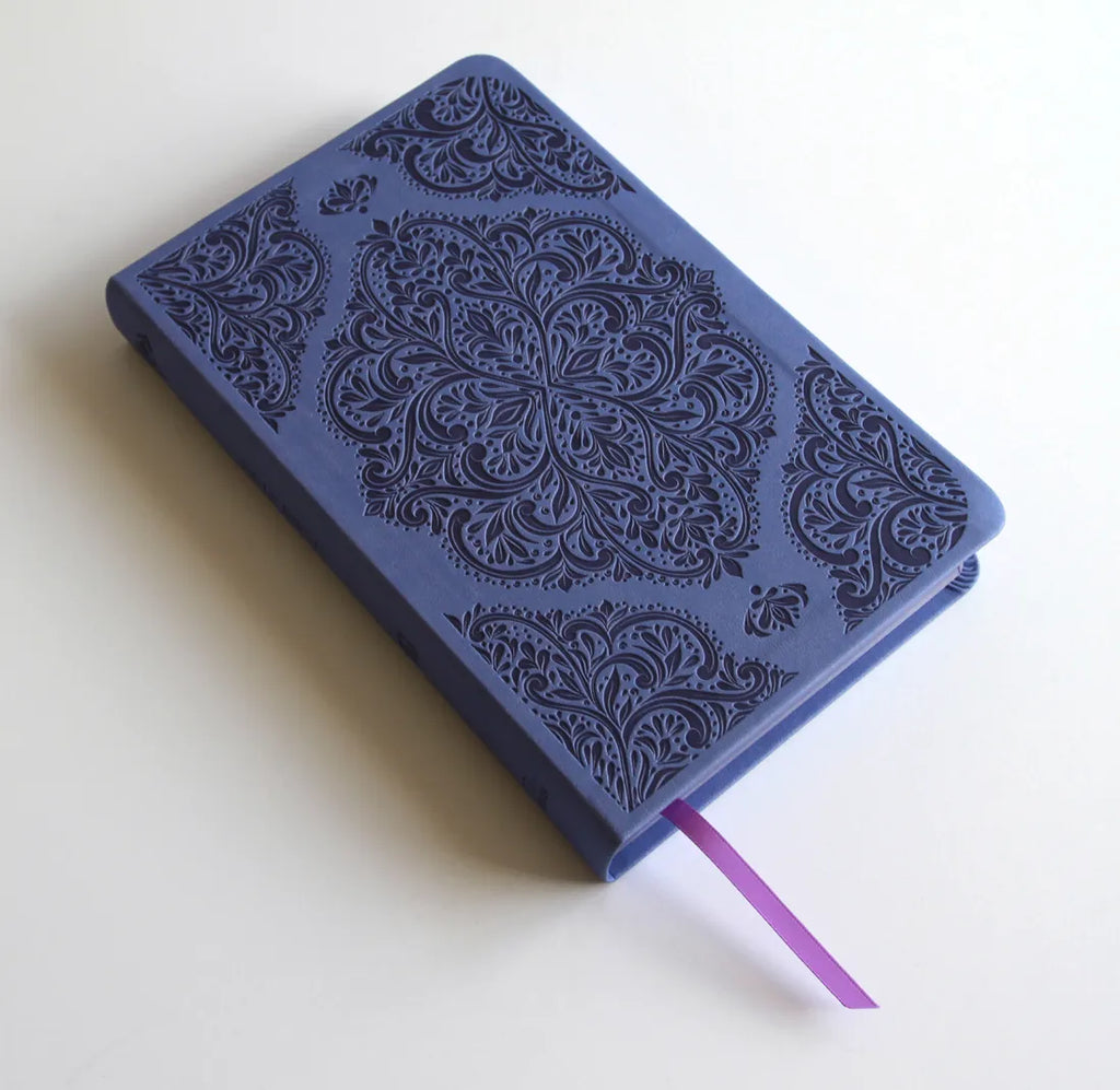 A soft satin ribbon marker and thumb-indexing tabs make navigation effortless. Designed with convenience in mind, the flexcover opens completely flat without damaging the spine.
