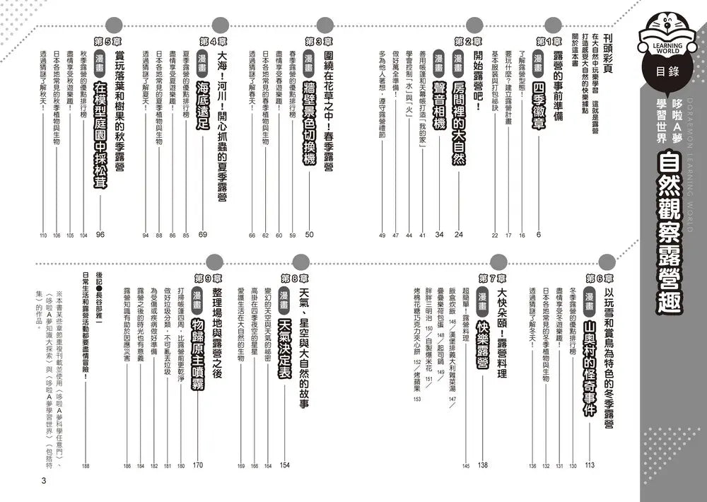 露營是件讓人既期待又興奮的戶外活動!這本書教你在享受露營的同時,也學會同步觀察自然,在大自然中安心安全的玩耍。從露營的準備、應攜帶物品,到如何搭帳篷、生火等等,涵蓋多種基礎知識。搭配季節還能進行自然觀察,認識各種有趣的動植物,成為他們的野外友善小夥伴。和哆啦A夢一起來學習有趣的戶外實作課吧! 不同季節有不同的露營玩法?如何認識野外的動植物?