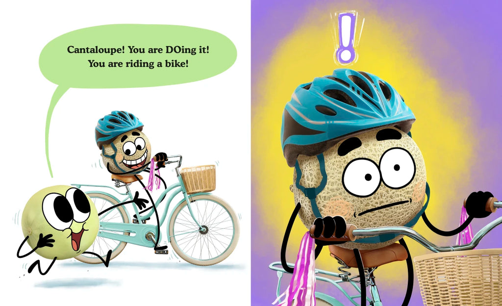 Cantaloupe has a new bike! HoneyDo wants to see him do cool tricks. But Cantaloupe can’t do tricks. He can’t even ride. And he’s not sure he can learn. No problem—HoneyDo will show him. Sort of? You’ve never seen bike-riding like this!