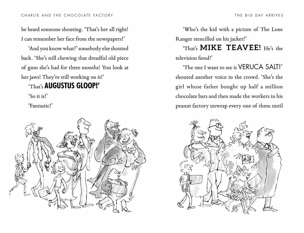 But only five lucky children will be allowed inside. And the winners are: Augustus Gloop, an enormously fat boy whose hobby is eating; Veruca Salt, a spoiled-rotten brat whose parents are wrapped around her little finger; Violet Beauregarde, a dim-witted gum-chewer with the fastest jaws around; Mike Teavee, a toy pistol-toting gangster-in-training who is obsessed with television; and Charlie Bucket, Our Hero, a boy who is honest and kind, brave and true, and good and ready for the wildest time of his life!