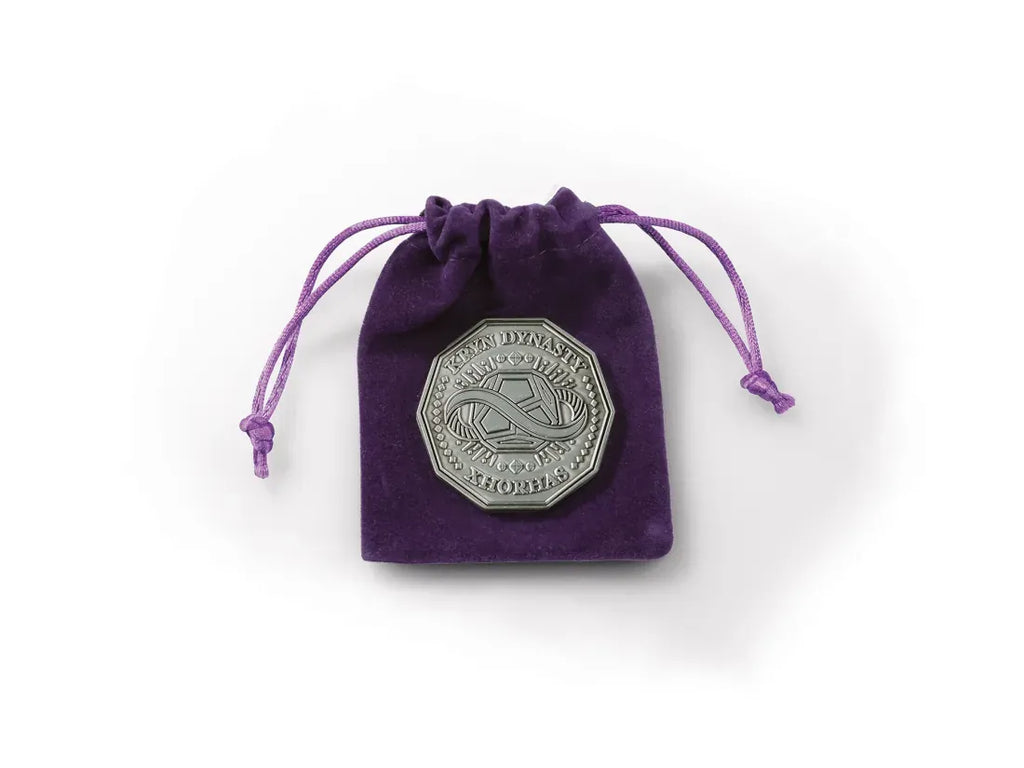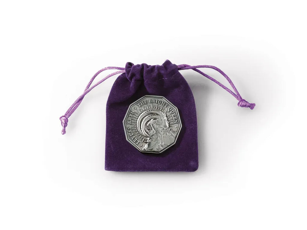 - Velvet pouch containing a coin featuring an image of the Bright Queen.