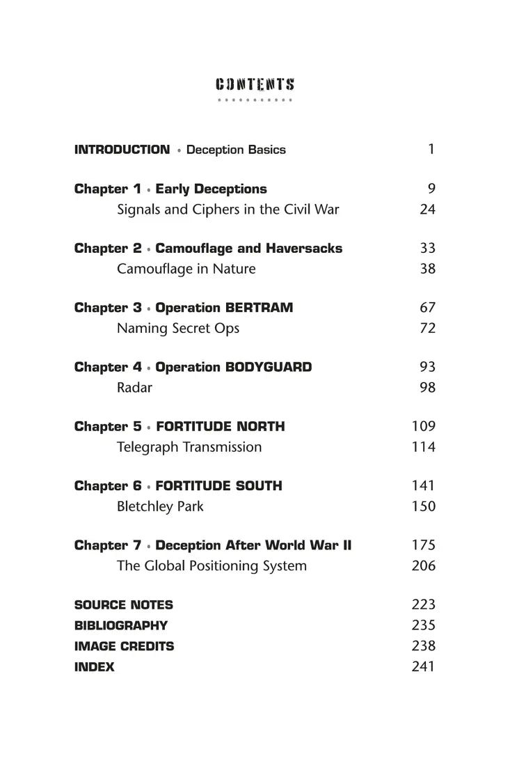 The biblical account of Gideon. The ancient story of the Trojan horse. Deceptive techniques have been used in war through the ages. But while the principles have changed very little, the technology behind fooling the enemy has evolved dramatically. Paul B. Janeczko’s fascinating chronology focuses on the American Civil War, World Wars I and II, and the Korean War, the Vietnam War, and the Gulf Wars to reveal evolving attitudes toward the use and effectiveness of deceptive operations. Find out the secret plan behind the invasion of Normandy and the details of General Schwarzkopf’s “Hail Mary play” during the Gulf War, among many other strategies and maneuvers designed to pull the wool over enemies' eyes. Back matter includes source notes, a bibliography, and an index.