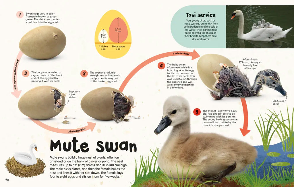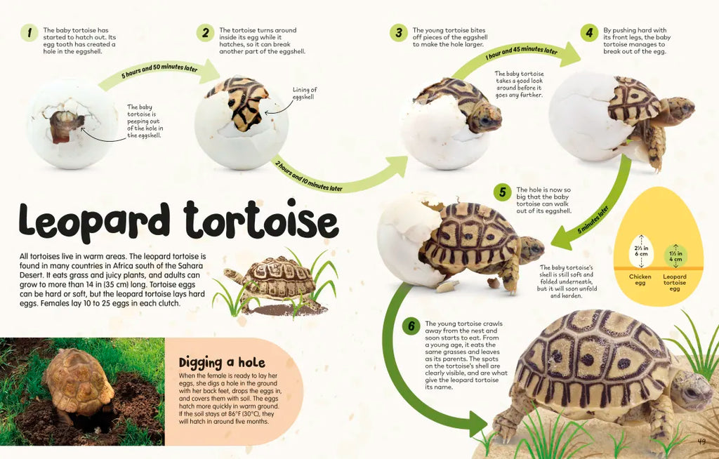 - Large, detailed photographs show eggs hatching almost in real-time.