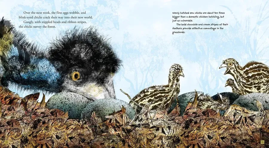 In the open eucalyptus forest of Australia, an emu as tall as a human settles down on his nest to warm and protect the eggs left by his mate. When they hatch, the chicks will be ten times bigger than domestic chicken hatchlings and covered in chocolate-and-cream stripes to provide camouflage in the grasslands. This unusual family sticks together until the hatchlings grow up, facing dangers that include eagles and dingoes. Ornithologically inclined youngsters will delight in this visually striking chronicle full of fun emu facts.