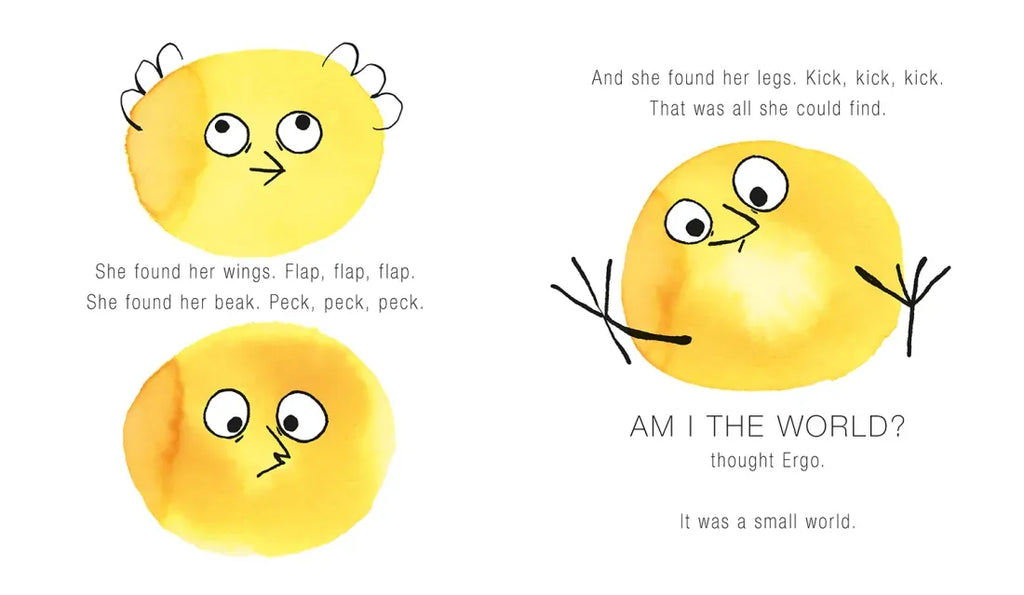 For budding philosophers of all ages, this is the uplifting story of Ergo the chick. Ergo wakes up and sets about exploring her world. She discovers her toes. She discovers her wings and her beak. She has discovered EVERYTHING! But then she considers the wall. And something outside the wall goes BUMP. What could it be? The only way to find out is to peck peck peck through to the other side...