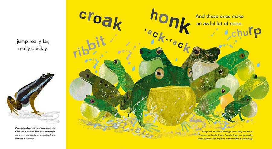 Conservation biologist Martin Jenkins takes a funny and affectionate look at frogs around the world, from the mighty West African Goliath frog and colourful South American Poison Arrow frog to the south-east Asian Flying frog and the humble frog in your garden pond. Both author and illustrator delight in the diversity and occasional weird behaviour of these small and much loved creatures. Tim Hopgood's bold and playful illustrations succeed in capturing each frog's defining characteristics, and the largest and smallest frogs in the world are drawn to scale which helps bring them to life even more. An engaging and informative book with captions, fact pages and an index.