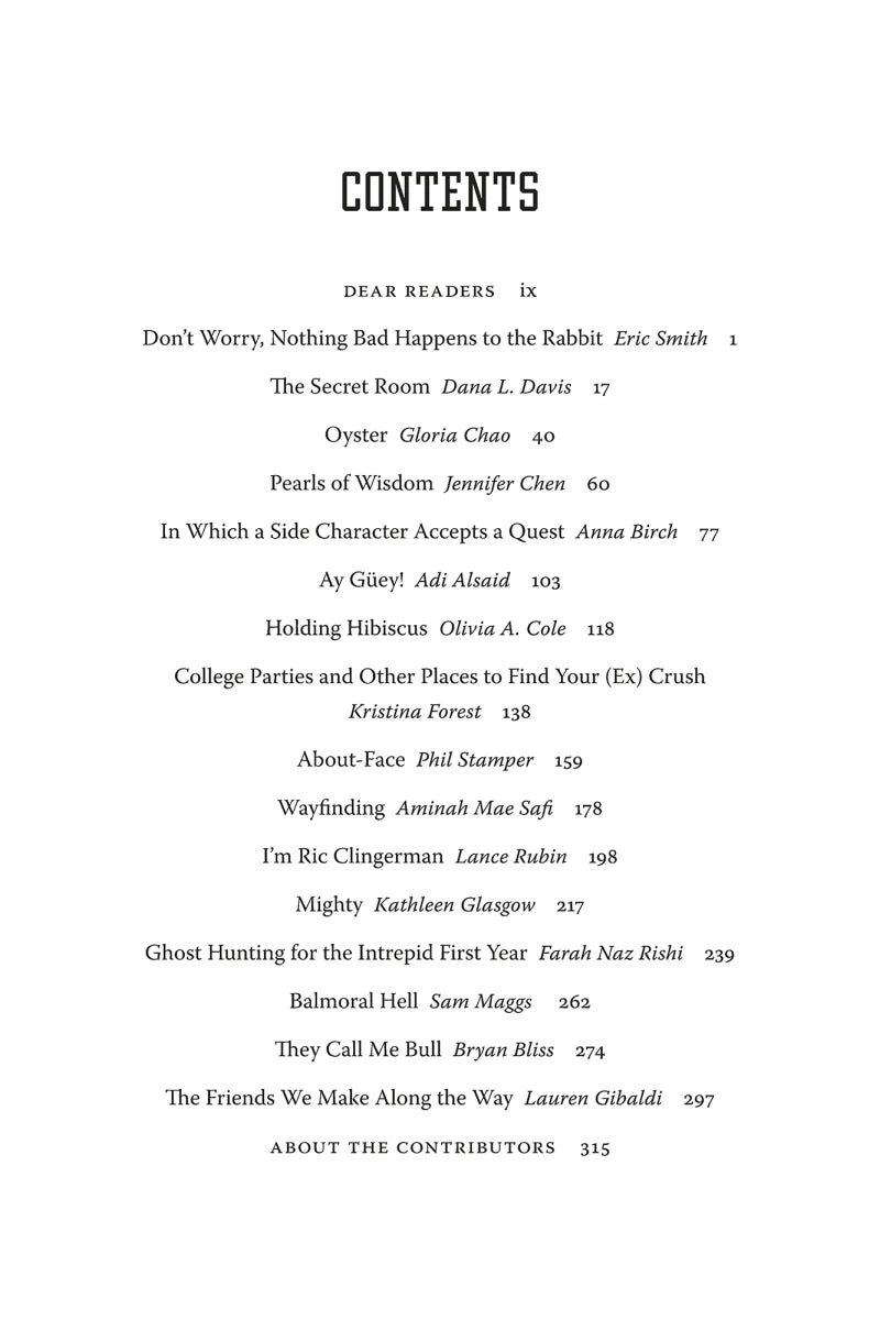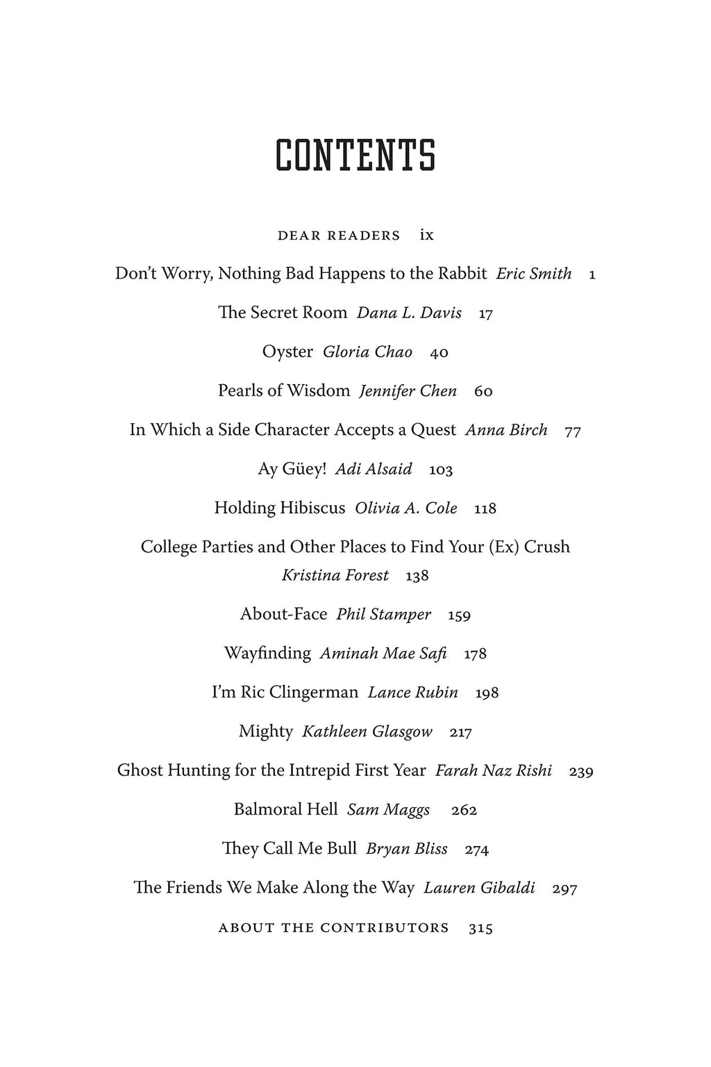 Adi Alsaid * Anna Birch * Bryan Bliss * Gloria Chao * Jennifer Chen * Olivia A. Cole * Dana L. Davis * Kristina Forest * Lauren Gibaldi * Kathleen Glasgow * Sam Maggs * Farah Naz Rishi * Lance Rubin * Aminah Mae Safi * Eric Smith * Phil Stamper