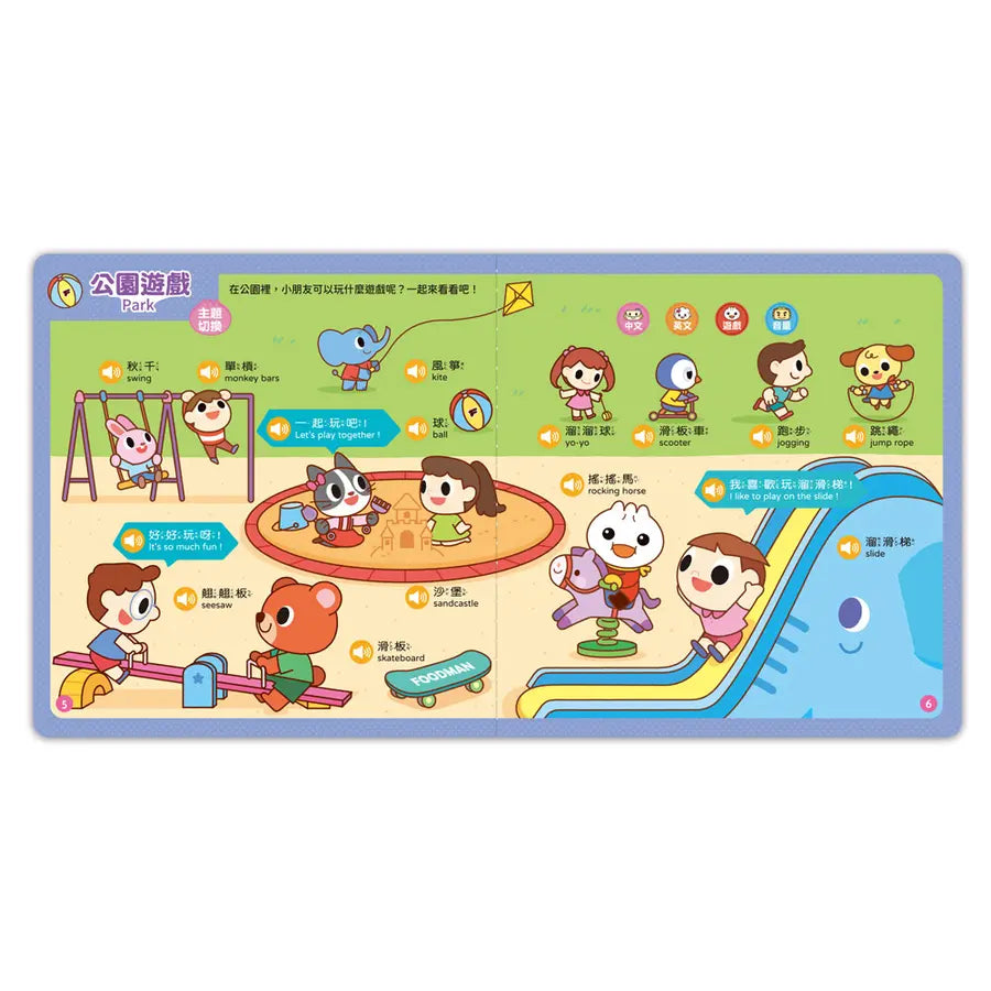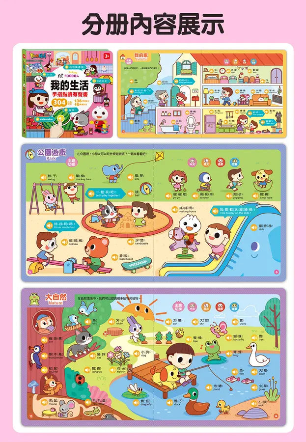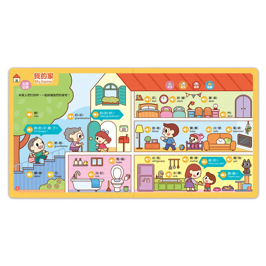304個手指點讀互動遊戲、136個雙語單字,16句日常會話,中英雙語專業發音,搭配書中簡單小說明,讓孩子搭配書中故事情節,理解生活中的單字和物品!