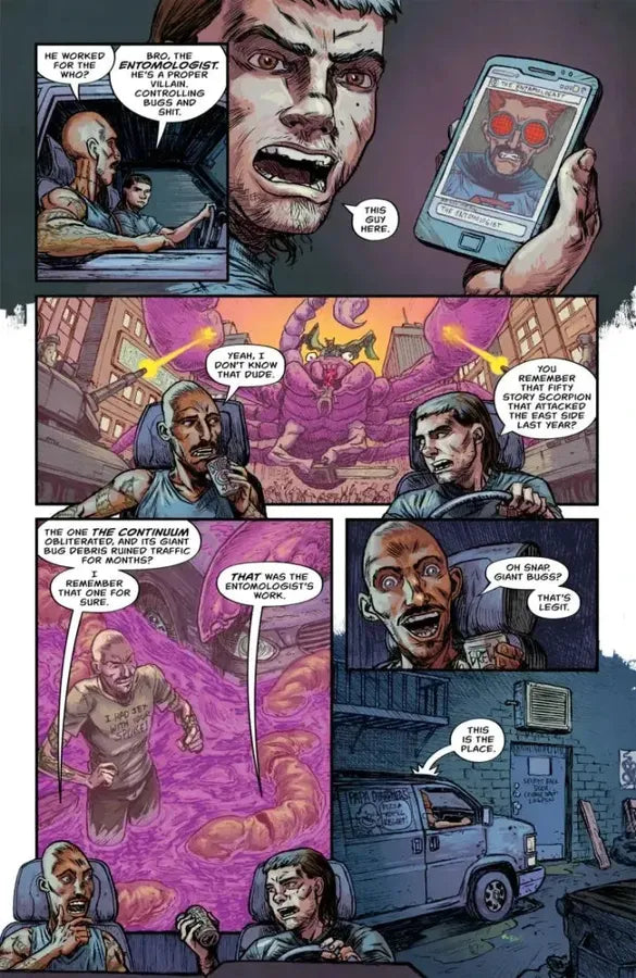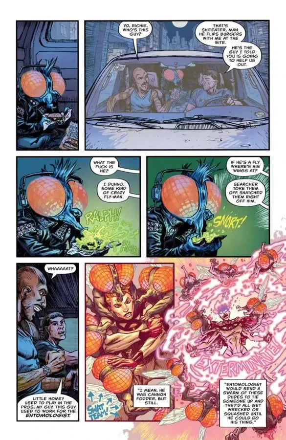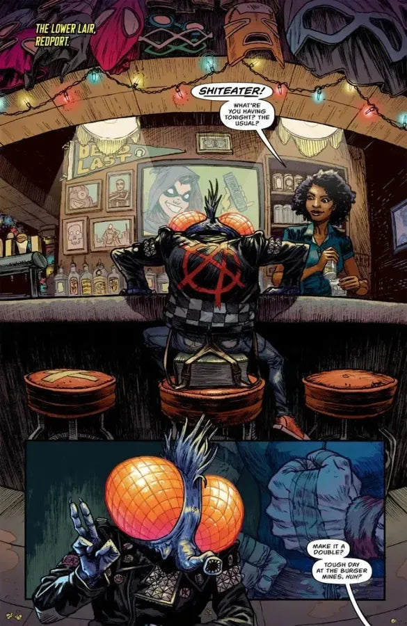The Lower Lair bar is home to all sorts of supervillains, lowlifes, and scumbags... but only one of them has to puke digestive fluids onto his food to eat. $#!%eater, the humanoid mutant fly, is a loser, a lifelong minion who lives to serve his criminal master. But what happens to a henchman when he no longer has anyone left to hench for?