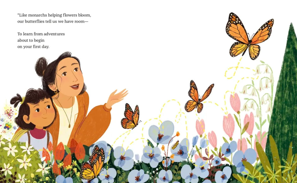 As she and her mom make their way to school, Mom explains how the butterflies are a good thing. Everyone gets them (including parents) and they are a sign of something exciting happening—that we're about to learn and grow from a new experience and they can help us through it.