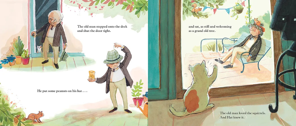 Ever since the old man found a little kitten under his hat, the two have been the best of friends. There are always plenty of kitty rubs and food and talk to go around. Every day, Hat watches as the old man goes outside to sit and feed the squirrels with nuts he places on top of his hat. But Hat the cat is not allowed to join him. What if Hat ran away, or chased the squirrels – or worse? Then, the old man leaves and does not come back the next day, or the one after that. When people come by to take care of Hat until the old man returns, will one little girl give Hat the chance he’s been hoping for? Troy Wilson’s tender prose, along with Eve Coy’s charmingly detailed illustrations, bring readers a sweet story about companionship, love, and trust.
