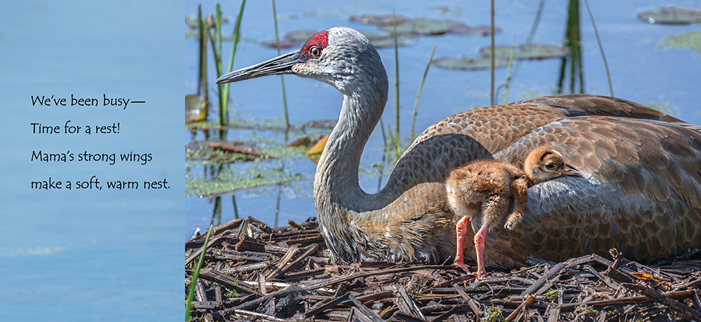 Peek in as a sandhill crane hatchling makes its first wobbly stand and takes its first steps alongside its brother. With their parents close by, they flap their wings and dance before enjoying a buggy treat. Someday they will fly with the majestic cranes overhead, but for now, Mama’s soft feathers beckon. With a lyrical narrative and lovely photo illustrations, this latest venture from an acclaimed creative team makes a perfect new baby gift — and will appeal to bird lovers, too.