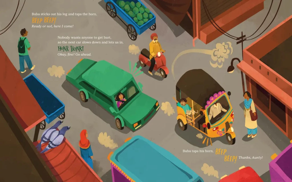 Ibraheem and his cat, Mitu, join Baba on a rickshaw trip through the big city, where vehicles of all sorts and sizes have their own language to help them navigate the busy streets.