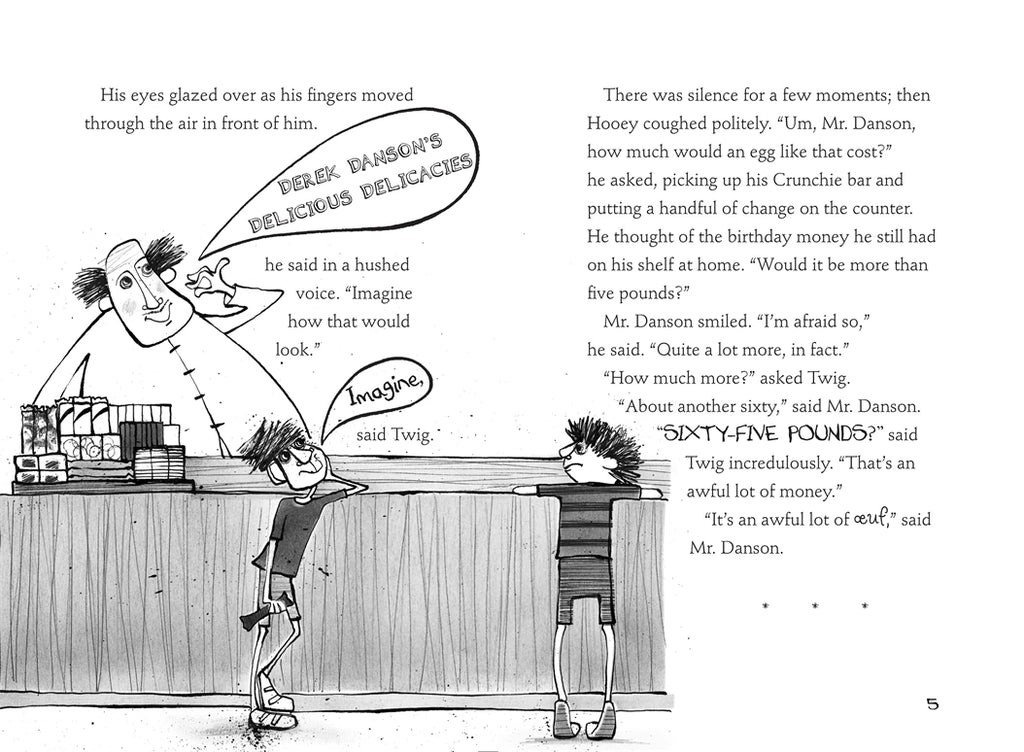 Welcome to a land called Shrimpton-on-Sea where the folks are a bit unusual and you can make friends with Hooey, Twig, Will and Dingbat the dog. Are they naughty, slightly scruffy boys? Yes they are. Will they do anything for a few quid? Yes they will. What’s so unusual about that, then? Well, it all starts with the giant chocolate egg, and then there's catching the shark in the flowery duvet cover and then Twig dresses up as a sea-urchin and gets chased through the knicker shop by Basbo the bully (boo, he's mean!) and then there's the big explosion and everything. But it all makes sense when you read it.