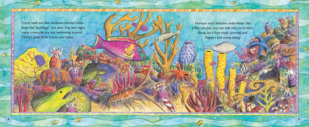 Earle takes children on an undersea journey to explore an amazing "underwater city." She explains the formation of coral reefs and provides information about the conditions needed for survival. In addition, the author introduces other animals that live in and near the reef and stresses the importance of protecting corals from pollution. Matthews's ink-and-gouache paintings bring the colors and variety of this habitat to life. The book also includes a simple experiment that demonstrates how "filter feeders" strain food from the water.