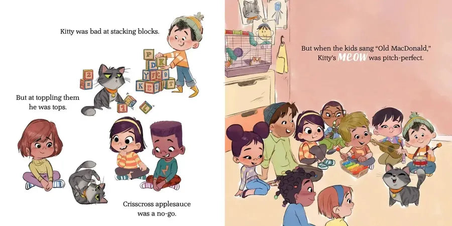 At kindergarten, Kitty is not able to do the things he usually does. He can't watch his nature shows, sharpen his claws, or hunt for snacks. But with the help of his good, nice boy and the teacher, Kitty learns that he can enjoy trying new things...and still get home in time for supper.
