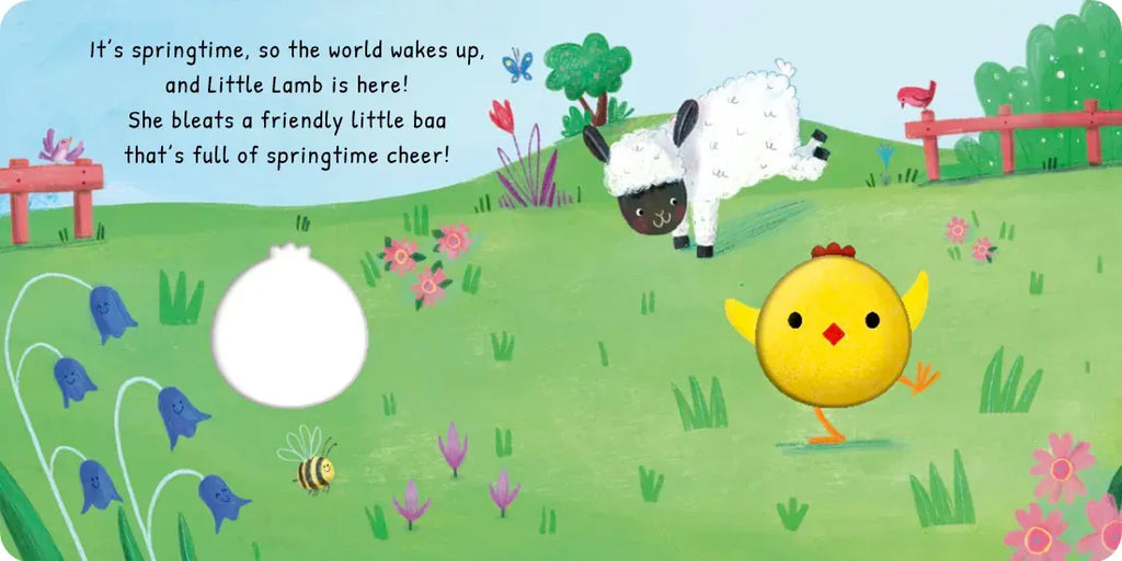 It’s springtime, and Little Chick is singing happily! She visits Little Lamb, who bleats a happy “baa!” The birds are learning to fly and call “cheep, cheep!” as the warm sun brightens up the sky. The butterflies flutter around Little Chick, the flowers bloom, and the baby rabbits hop through the forest. Features a soft, squishy, glittery chick that shows through the front cover and on each spread.
