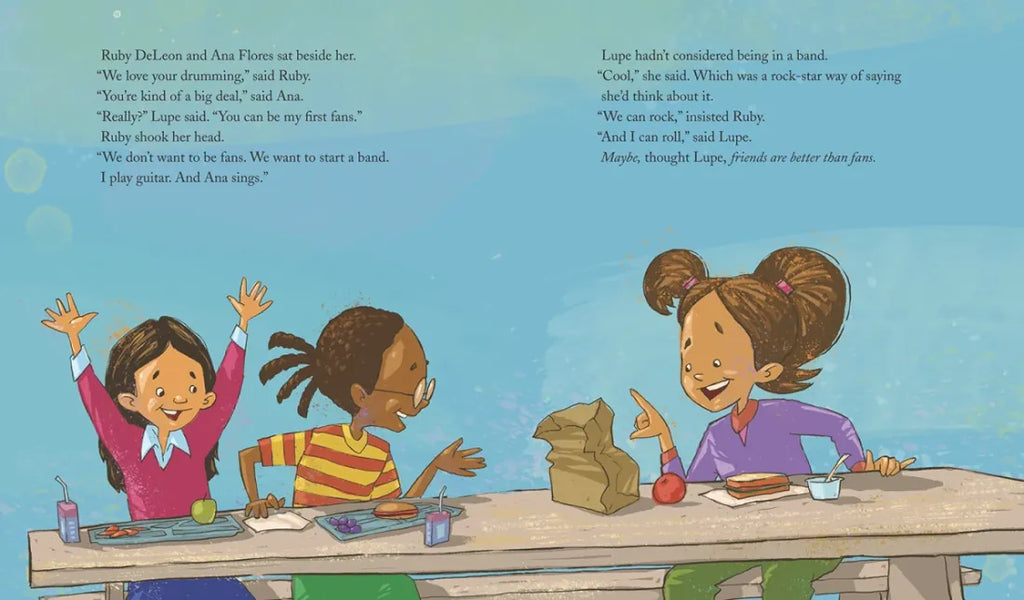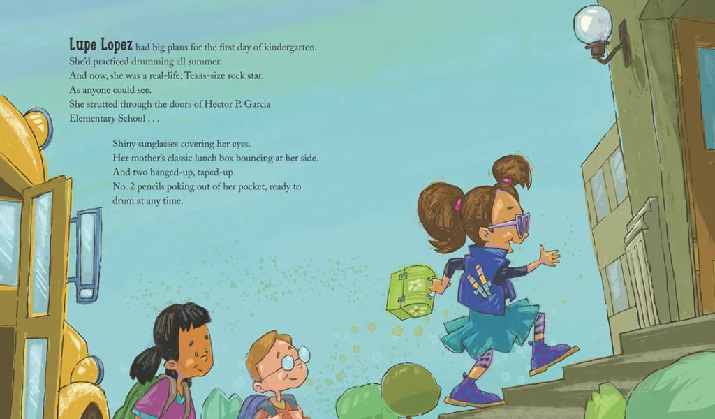 When Lupe Lopez struts through the doors of Hector P. Garcia Elementary in sunglasses with two taped-up Number 2 pencils—drumsticks, of course—poking from her pocket, her confidence is off the charts. All day, Lupe drums on desks, tables, and chairs while Ms. Quintanilla reminds her of school rules. Lupe has her own rules: 1) Don’t listen to anyone. 2) Make lots of noise. ¡Rataplán! 3) Have fans, not friends. But with her new teacher less than starstruck, and fans hard to come by, Lupe wonders if having friends is such a bad idea after all. Can it be that true star power means knowing when to share the spotlight? With its spirited illustrations and a simple text threaded through with Spanish words, this picture book is proof positive that being a strong girl moving to her own beat doesn’t have to mean pushing others away.