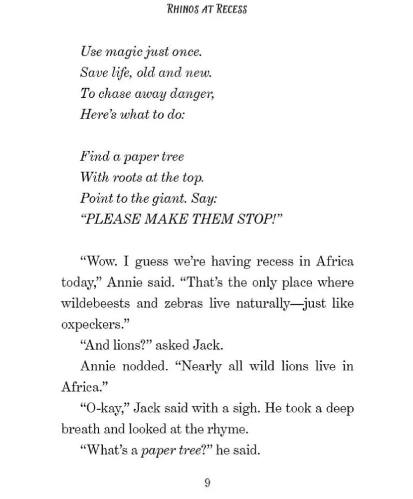 Jack and Annie are on the playground at recess when they feel the magic tree house calling them. They sneak away and are whisked off on an adventure in South Africa, where a majestic rhino needs saving! There are a swooping helicopter, strict park rangers, and--most terrifying of all--poachers. How do you hide one of the largest land mammals in the flat terrain of the African savanna? Jack and Annie are going to need a little bit of magic for this mission!