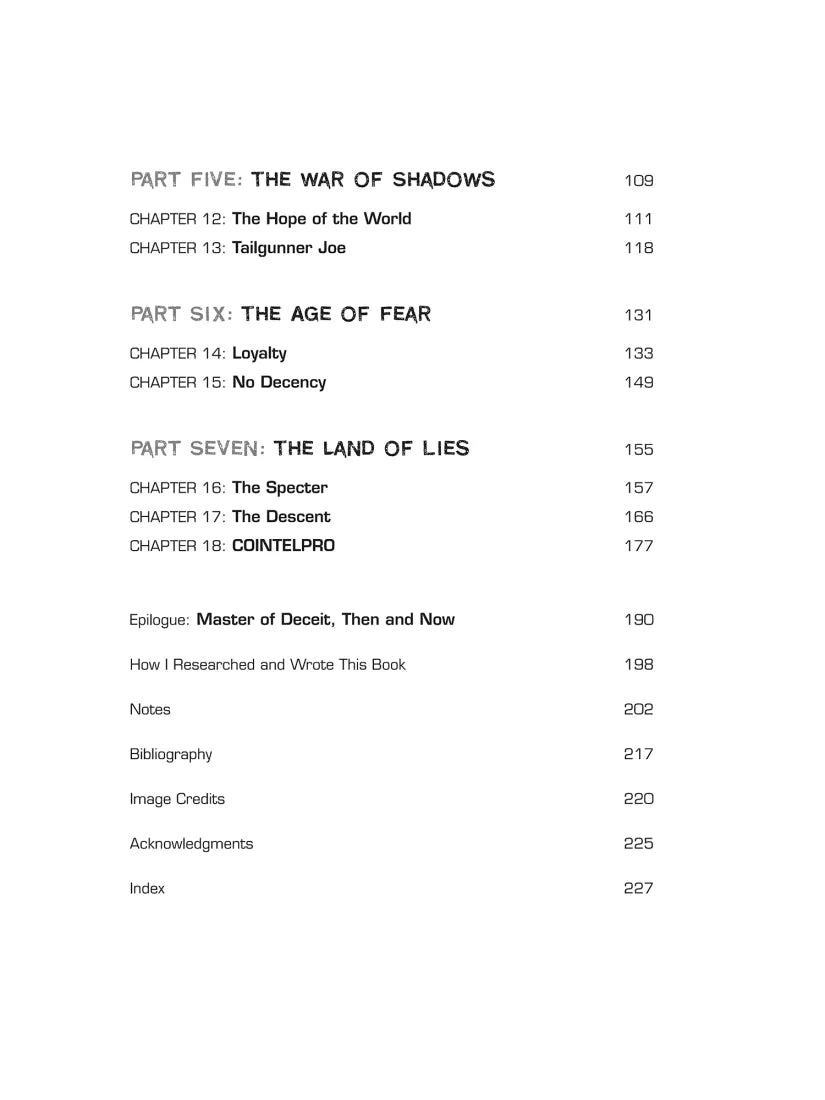 Dr. Martin Luther King received this demand in an anonymous letter in 1964. He believed that the letter was telling him to commit suicide. Who wrote this anonymous letter? The FBI. And the man behind it all was J. Edgar Hoover, the FBI's first director. In this unsparing exploration of one of the most powerful Americans of the twentieth century, accomplished historian Marc Aronson unmasks the man behind the Bureau- his tangled family history and personal relationships; his own need for secrecy, deceit, and control; and the broad trends in American society that shaped his world. Hoover may have given America the security it wanted, but the secrets he knew gave him — and the Bureau — all the power he wanted. Using photographs, cartoons, movie posters, and FBI transcripts, Master of Deceit gives readers the necessary evidence to make their own conclusions. Here is a book about the twentieth century that blazes with questions and insights about our choices in the twenty-first. Back matter includes an epilogue, an author’s note, source notes, a bibliography, and an index.