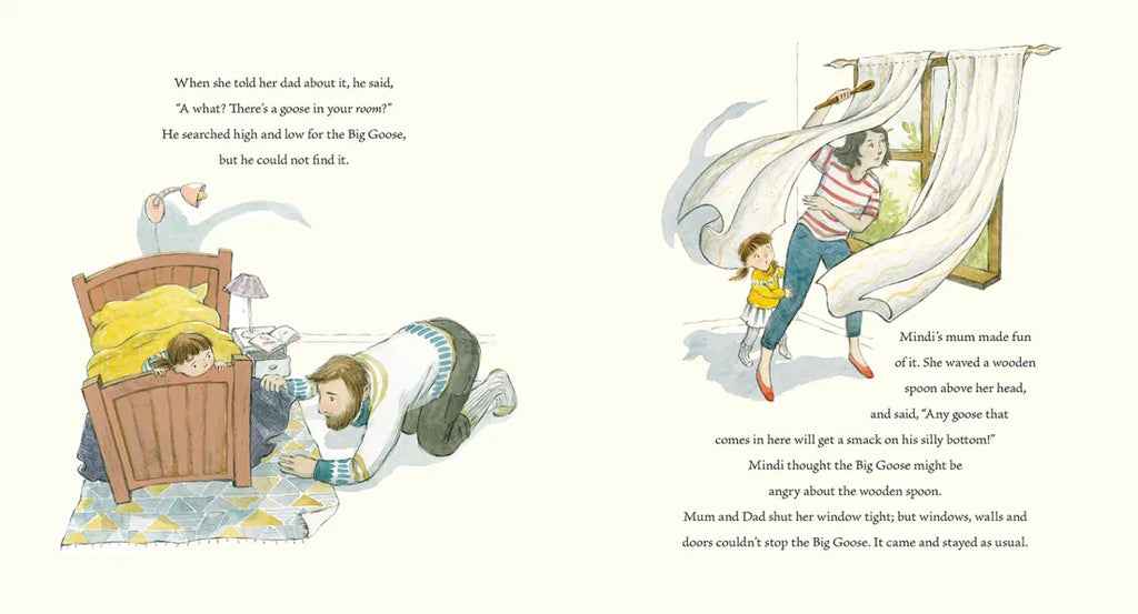 Once there was a girl called Mindi who was afraid of something that no one else could see. This thing that she was afraid of, this thing that no one else could see, was a big goose. It came into her room as quietly as a thought comes into your head. . . .