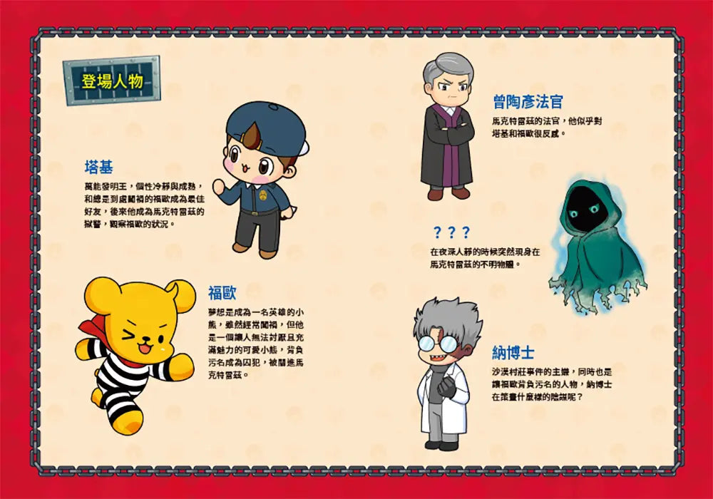 ◎福歐:夢想是成為一名勇士的小熊,雖然經常闖禍,但他一個讓人無法討厭且充滿魅力的可愛小熊,背負污名成為囚犯被關進馬克特雷茲。